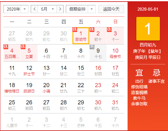 5月1日至5日放假調休,共5天。4月26日(星期日)、5月9日(星期六)上班
