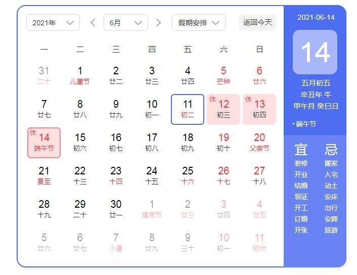 根據(jù)國務(wù)院辦公廳通知精神,現(xiàn)將2021年端午節(jié)放假安排通知如下:6月12日(星期六)至14日(星期一)放假,共3天。
